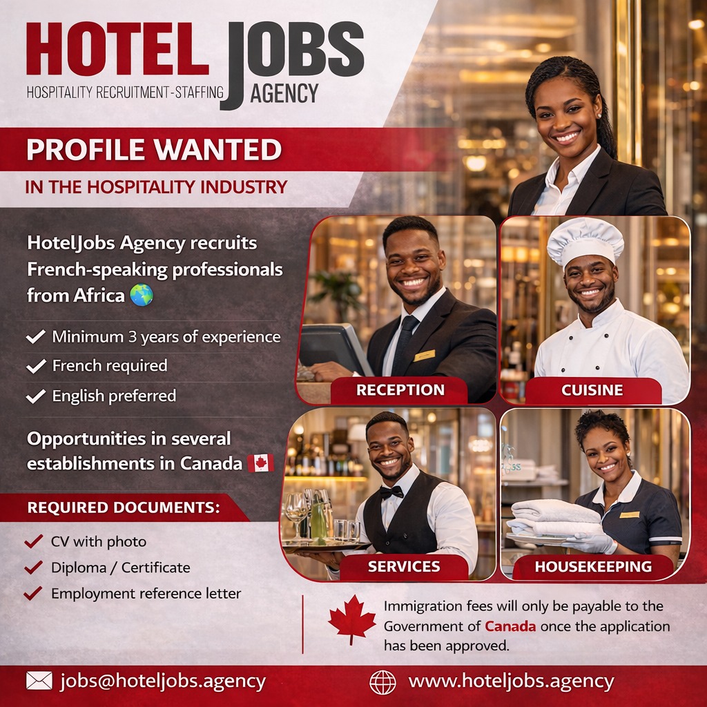 HotelJobs Agency is currently recruiting experienced hospitality professionals from Africa to join prestigious establishments across Canada. We are looking for talented individuals in the areas of Reception, Sales, Services, and Housekeeping who are ready to elevate their careers in North America.